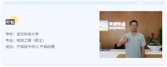 来申通的契机源自于去年秋季的校园招聘会,本身我是物流工程专业,对于快递行业非常感兴趣,也算是专业对口。在选择岗位的时候,我听到HR介绍到了产品经理,过去在实习的时候我也做过产品相关的事情,所以非常感兴趣,最终通过了面试,如愿以偿。
