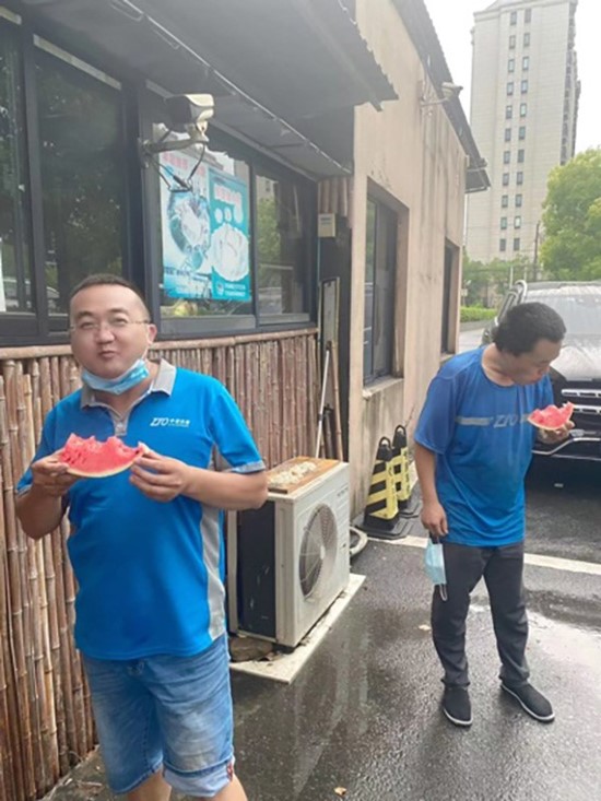 7月15日下午,上海中通快递上海虹桥北部网点,快递小哥吃冰西瓜防暑降温。
