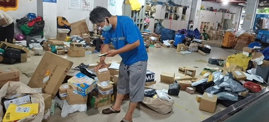 7月15日下午,上海中通快递上海虹桥北部网点,快递员正在分拣快件。