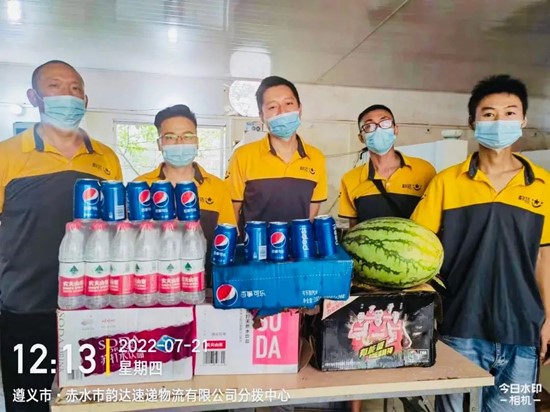 在贵州,韵达贵州省公司结合一线员工实际需求,从实用、方便携带等方面考虑,精心准备并亲自将西瓜、可乐、苏打水、纯净水等慰问品送至赤水、六枝等网点一线韵达小哥手中,感谢他们的辛勤工作和无私奉献,叮嘱他们在高温环境下工作,要合理安排休息时间,保持健康的身体和愉悦的心情。