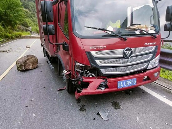 险情来得悄无声息——车子刚驶出隧道仅仅几十米,地震就发生了,石头从山上纷纷落下,一块目测有几百公斤的石头击中了快递车。万分庆幸的是,被石头击中的部位是车头右大灯位置。