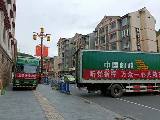 不允许有片刻的耽搁,甘孜州分公司再一次安排在家的5位技术娴熟的邮车驾驶员,紧急调派5辆8吨邮车,载上物资赶往震中磨西镇。