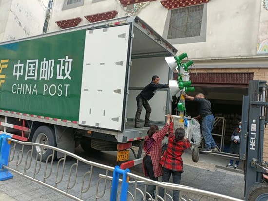 13时30分,4辆8吨邮车从甘孜州邮件处理中心出发,前往救灾物资储备中心装运帐篷、棉被、折叠床等救灾物资。