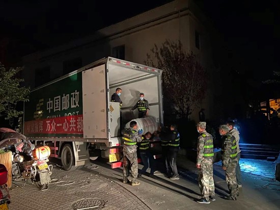 “轻拿轻放,速度要快!”在物资搬运中,政府组织民兵同邮政工作人员一起卸车、搬运。他们整齐地把救灾物资放在了政府指定的场地上,等待受灾群众过来领取,也等待救灾人员过来把帐篷支起。