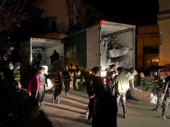 看到无家可归的受灾群众,邮政工作人员们顾不上吃饭和休息,急忙跳上邮车将帐篷、棉被、折叠床等往场地上搬运。