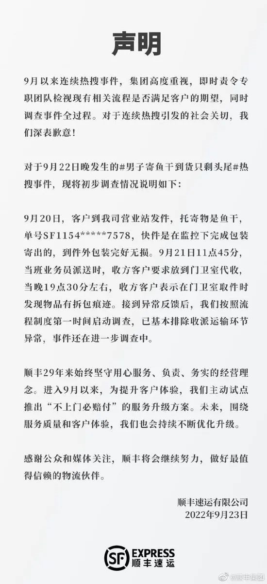 为此,今天(9月23日)顺丰发表了一份声明。顺丰表示,对9月以来连续热搜事件高度重视,即时责令专职团队检视现有相关流程是否满足客户的期望,同时调查事件全过程。对于连续热搜引发的社会关切,深表歉意。对于“男子寄鱼干到货只剩头尾”热搜事件,顺丰称,按照流程制度第一时间启动调查,已基本排除收派运输环节异常,事件还在进一步调查中。未来顺丰围绕服务质量和客户体验,将持续不断优化升级,做好最值得信赖的物流伙伴。
