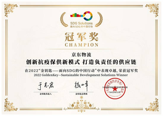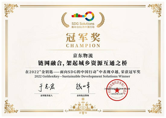 近日,由《可持续发展经济导刊》发起的“金钥匙——面向SDG的中国行动”落下帷幕,2022“金钥匙•冠军奖”正式出炉。经过初选、路演、视频终选,京东物流 “链网融合,架起城乡资源互通之桥”、“创新抗疫保供新模式,打造有责任的供应链”两项行动分别获得乡村振兴“金钥匙•冠军奖”和韧性价值链“金钥匙•冠军奖”,“青流计划”获得优胜奖。
