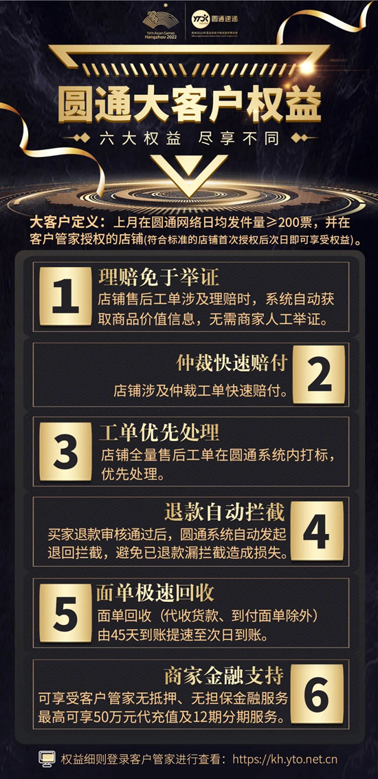 今年2月,圆通面向全网电商客户推出差异化营销产品——“大客户权益”:即圆通“客户管家”的绑定店铺,只要在圆通日均发件量≥200票,最快次日即可享受圆通为其打造的6大专属权益(详情请见海报)。上线一个多月时间,包括石先生在内的黄浦圆通超60%的客户就享受到了。